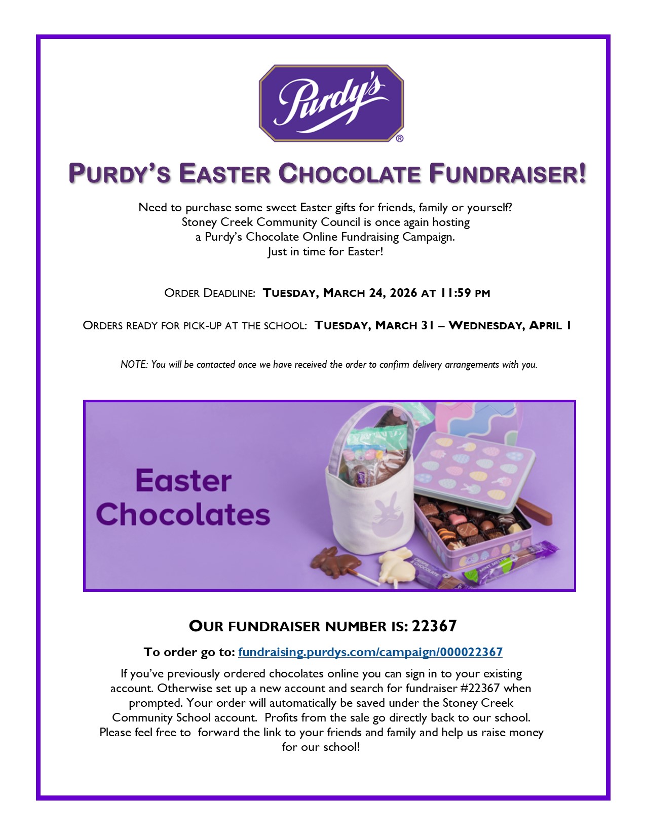 News Archive Easter Purdy’s Campaign Posted by stoneycreekadmin February 10, 2026 To order go to: fundraising.purdys.com/campaign/000022367