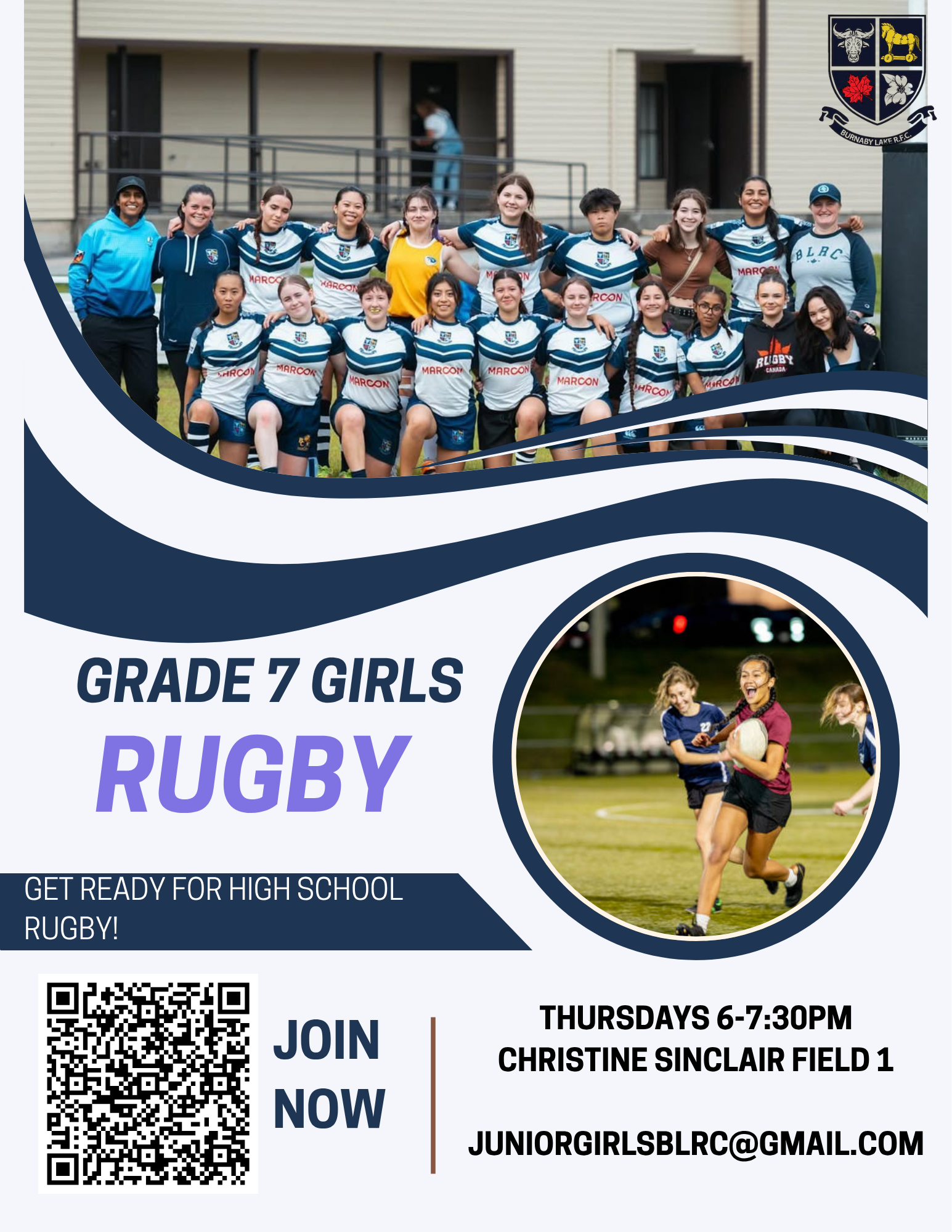 Grade 7 Girls Rugby – join now and get ready for high school rugby! Running on Thursday evenings at Christine Sinclair. Click here for more details.