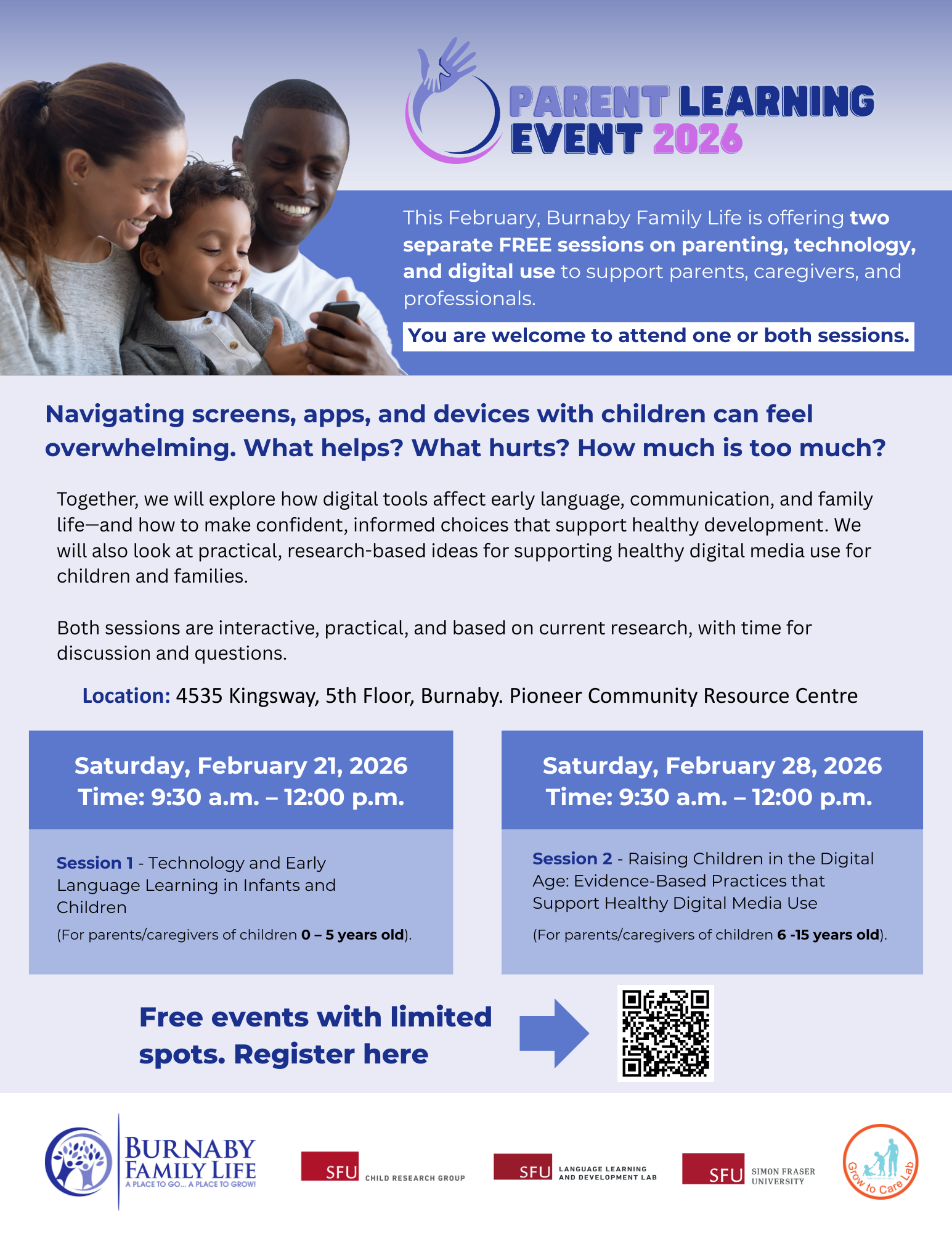 Parent Learning Event 2026 – This February, Burnaby Family Life is offering two separate FREE sessions on parenting, technology, and digital use to support parents, caregivers, and professionals. More details and registration information available on this flyer.