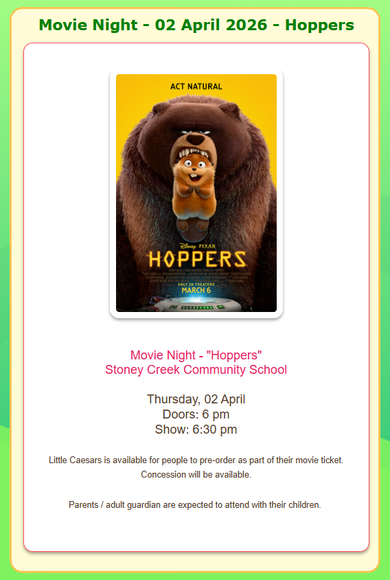 • Council Family Movie Night! Click here to view the flyer, order tickets and food on https://munchalunch.com/login (order deadline is 11:59 pm on March 26th)
